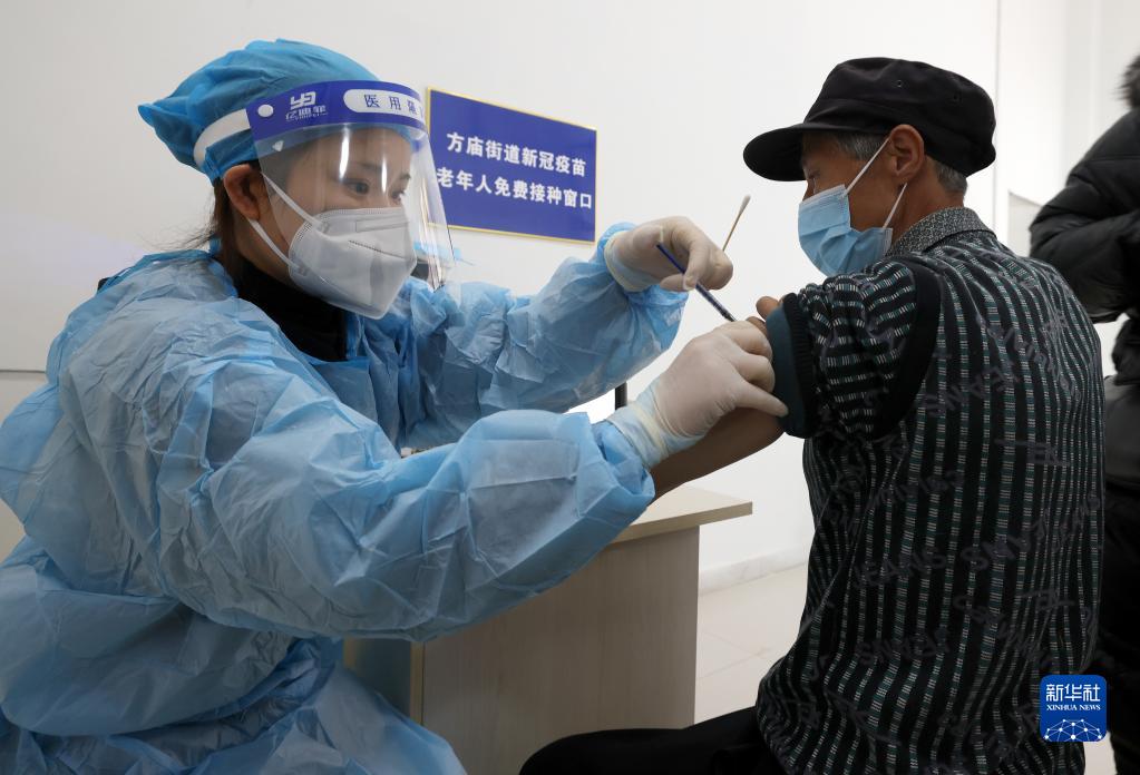 12月15日,在北京市海淀区中关村街道新冠疫苗接种点,医护人员为老年人接种新冠疫苗。新华社记者 任超 摄