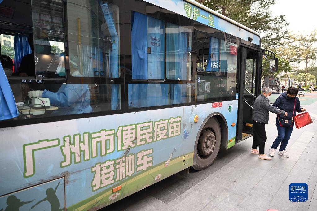 12月12日,在广州市荔湾区广钢新城,老年居民在接种新冠疫苗后走下便民接种车。新华社记者 邓华 摄