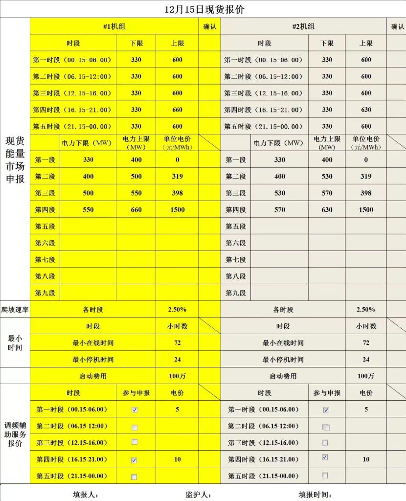 电力交易员做出的报价表。(受访者供图)