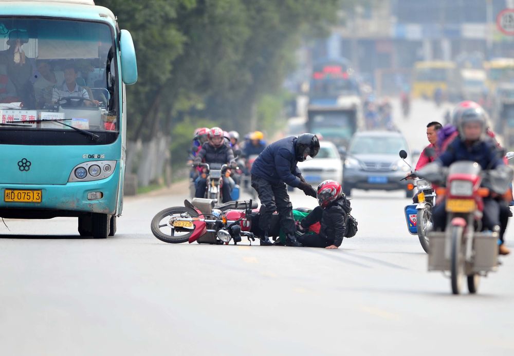 2013年2月3日,在小车队到达广西藤县天平镇前几分钟,一辆返乡摩托车被客车刮倒,所幸没有人员受伤。新华社记者 黄孝邦 摄