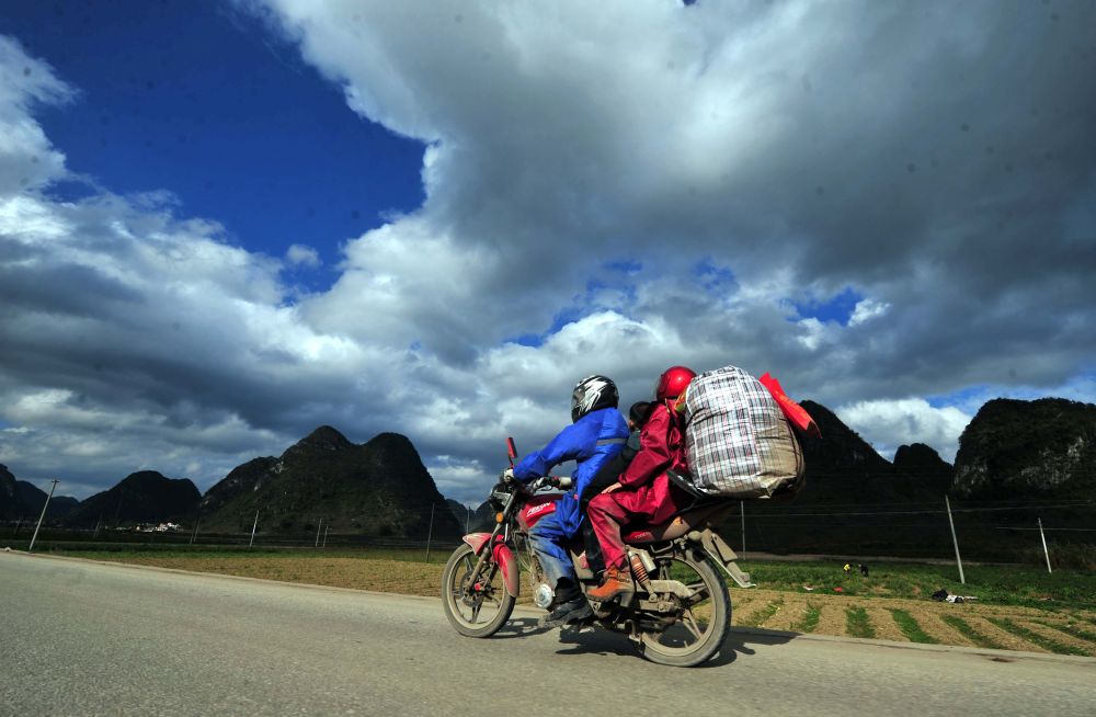 2013年2月4日,周生一家骑行在广西靖西市境内。