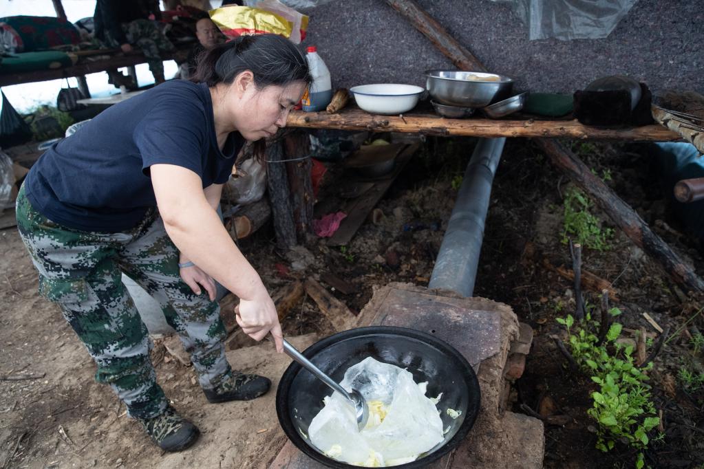 在漠河林场森林抚育队伍的临时帐篷内,闫秀艳用冰块炖菜。新华社记者张涛 摄
