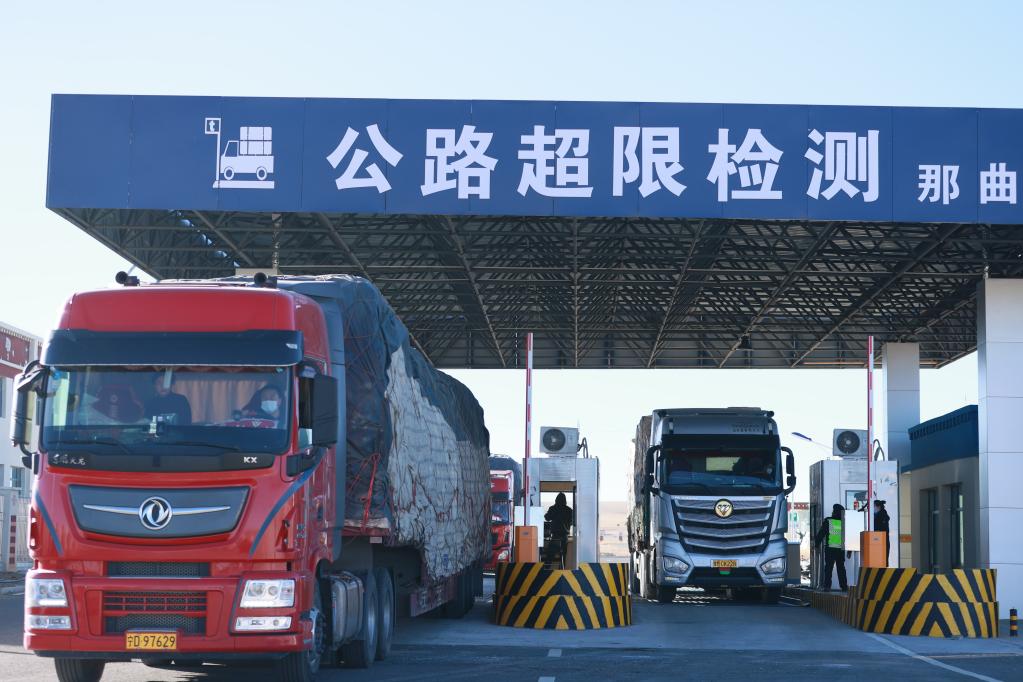 货车正在通过那拉高速公路那曲超限检测站。(西藏自治区交通运输厅供图)