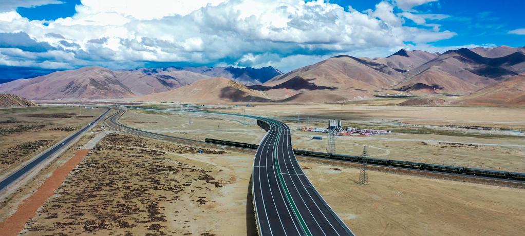 G6京藏高速公路那曲至拉萨段跨青藏铁路特大桥。这条公路于2021年8月全线通车(无人机照片)。新华社记者 刘洪明 摄