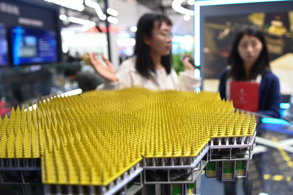 观众在2023年世界互联网大会“互联网之光”博览会的之江实验室展台了解射频相场望远镜核心单元(2023年11月7日摄)。新华社记者 黄宗治 摄