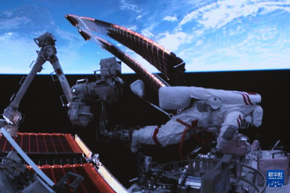 5月28日在北京航天飞行控制中心拍摄的神舟十八号航天员李广苏在空间站组合体舱外作业的画面。新华社记者 李杰 摄