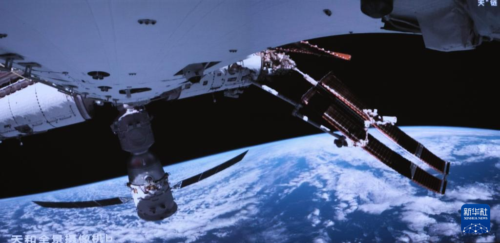 5月28日在北京航天飞行控制中心拍摄的神舟十八号航天员叶光富在空间站机械臂辅助下进行舱外作业的画面。新华社记者 李杰 摄
