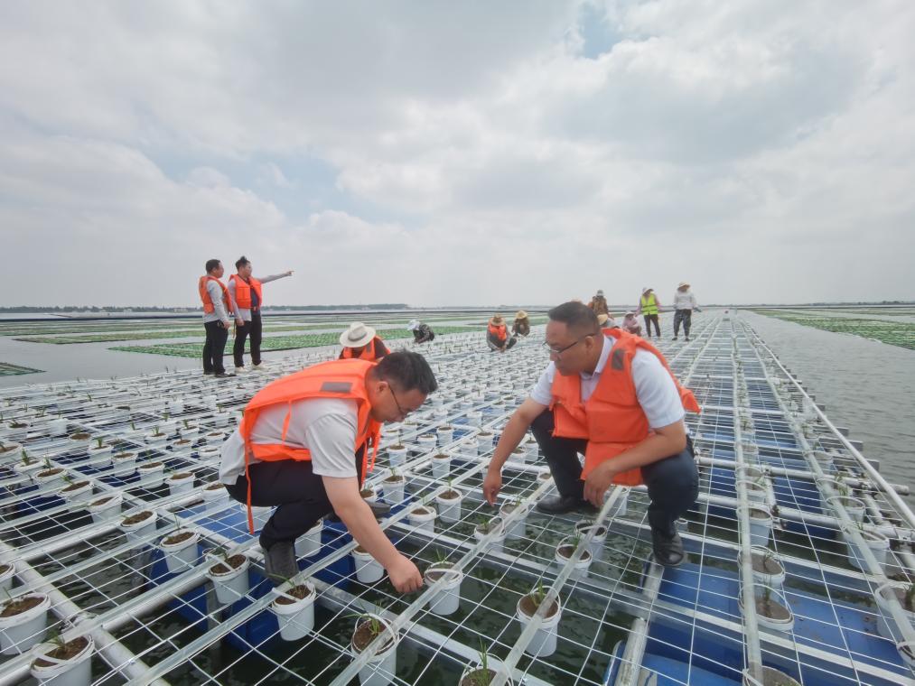 7月30日,项目工作人员在采煤地表沉陷区水面进行田间管理。新华社发(谢睿摄)